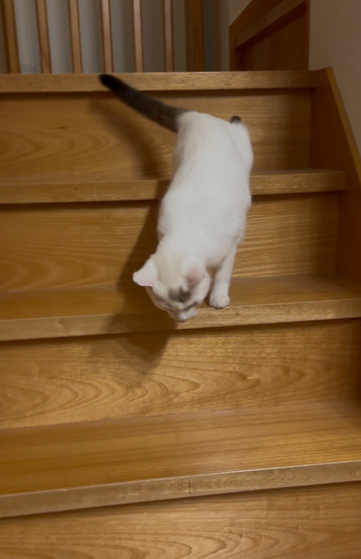 シンバは、トコトコと階段を下りてくると、「階段を下りたら何か楽しいことがある!」と思ったのか、躊躇することなく降りてきました。そして、その先にはアッシュ兄が!