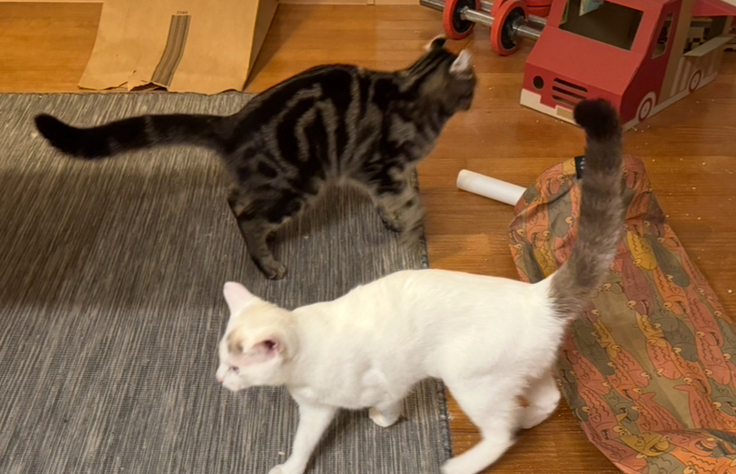 シンバは尻尾をピンと立てて部屋中を走り回り、まるで鬼ごっこのようにアッシュが追いかけます。シンバはとても楽しそうで、アッシュがタッチしようとするのを見事にかわしていました。シンバの「ミニ新幹線」が全速力で登場です!シンバの動きがとても速いため、アッシュの動きが何テンポも遅れているように見えました。