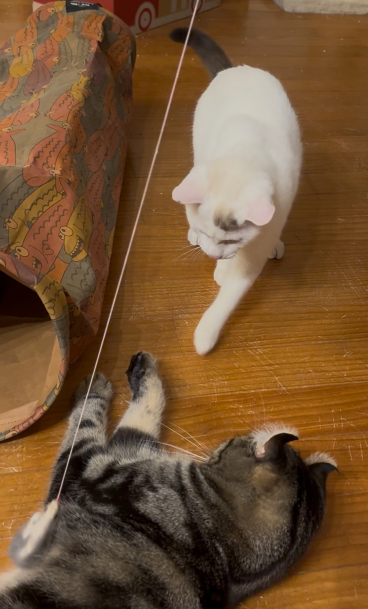 追いかけっこの次は、ネズミのオモチャ遊び。ふたりが一緒に遊べる距離感を保ちながら、あとは自由に任せてみました。シンバが心から楽しそうにしている様子がとても印象的でした。アッシュも落ち着いて遊んでいましたが、途中から両手でシンバを捕まえようとし始めたため、そこで触れ合い時間を終えました。