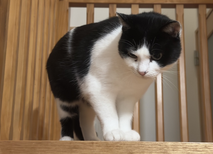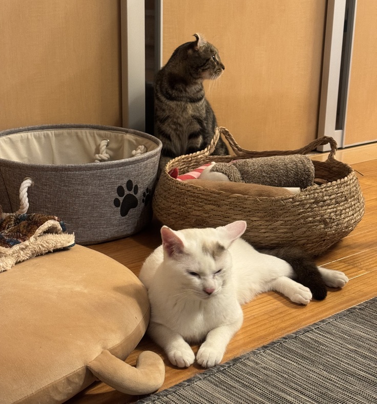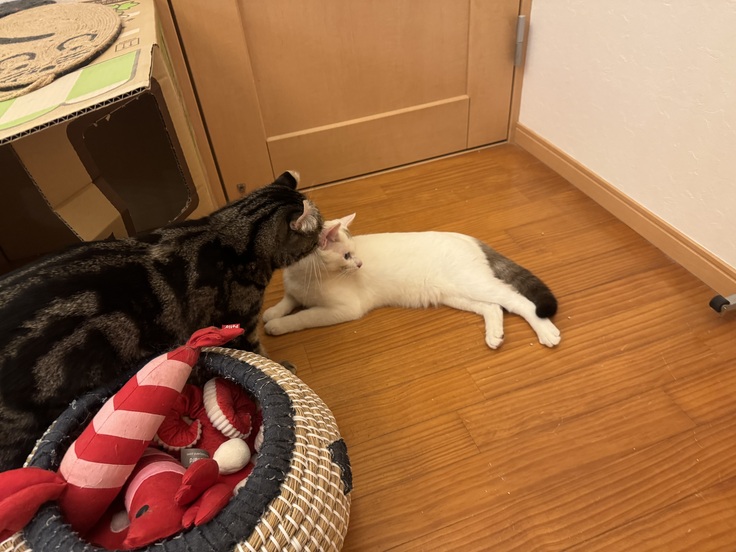最近は、シンバが少しずつアッシュがいる部屋に遊びに行く機会を増やしています。シンバは、以前は階段をおそるおそる降りていましたが、今では駆け降りるほど慣れてきました!