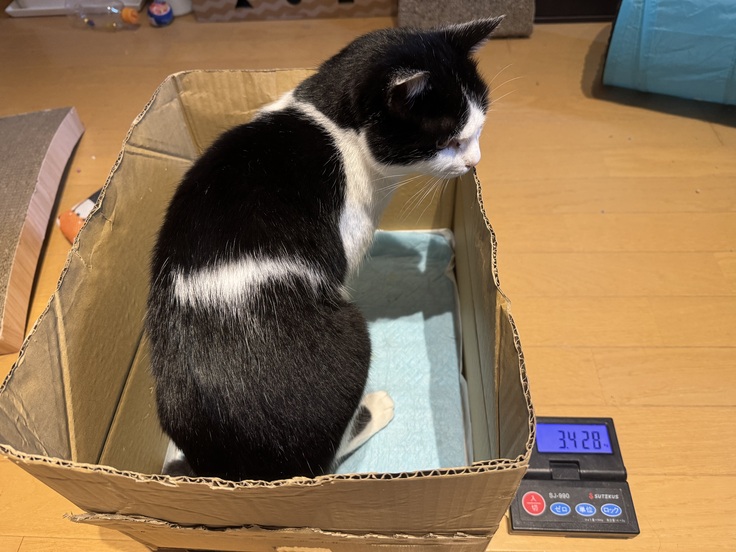 保護してから毎日体重測定をしていますが、測定用の箱に入るのを相変わらず嫌がります。捕まりそうになると、ミニ新幹線のように走り、クルッと向きを変えて逃げ足の速いこと!やっと箱に入ってくれたときは、体重が増えていると本当に嬉しさが倍増します。