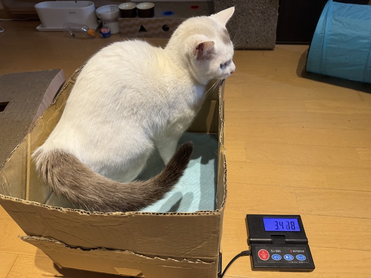 アテネは引き続き嘔吐もなく、安定した生活を送っています。ご飯の量はフードの袋に記載されている量より少し控えめにしています。袋の量は少し多すぎると感じるためです。シンバがアテネに追いついたと思うたびに、アテネも少し体重が増えていて、まだシンバよりほんの少し重い状態です。まるで体重鬼ごっこのようです。