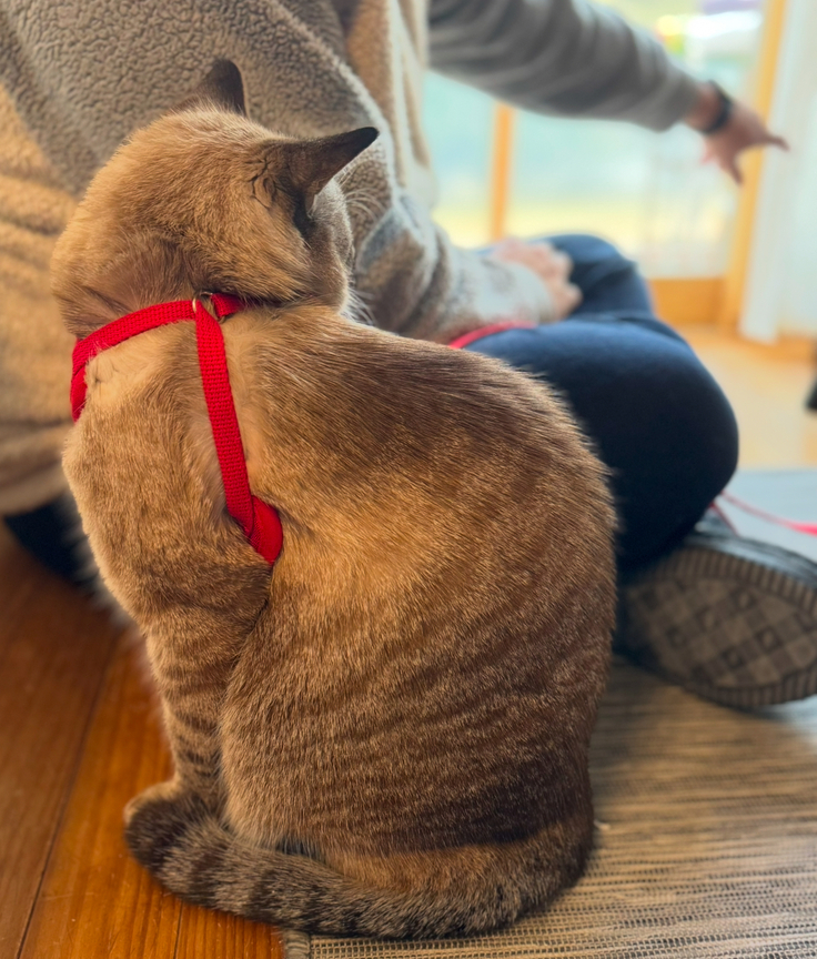 スモーキーがどう反応するか分からなかったため、ハーネスを付けて様子を見ましたが、シンバとアテネを見たとたんに銅像のように動かなくなりました。怖かったのか、今までに見たことのない表情をしていました。それでも少しずつ慣れてもらうため必要なことなので、スモーキーの気をそらすため、声をかけながら慎重に様子を見ました。