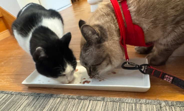 少しだけですが、スモーキーとアテネが食いしん坊同士で一緒にチュールを食べました!これからも様子を見ながら、また皆で少しずつ対面練習を続けていきたいと思います。スモーキーは、とても食いしん坊で。嫌なことも食べるものがあれば、頑張れます!
