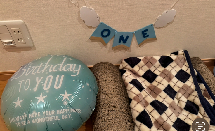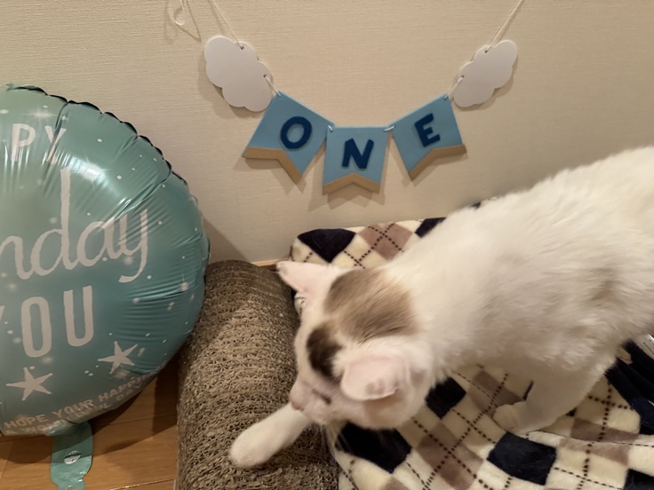 シンバが寝ている間にお誕生日の飾り付けをしましたが、起きてあっという間にどこかへ行ってしまいました。