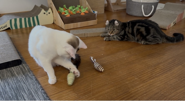 引き続き、皆が仲良く過ごせるとは言いませんが、せめてアテネが怖がらずにスモーキーと一緒に暮らせるよう願っています。でも、アテネが部屋の中で過ごしたいと感じているなら、無理に外に出す必要はないのかもしれませんね。人の勝手な考えなのかもしれないですね。