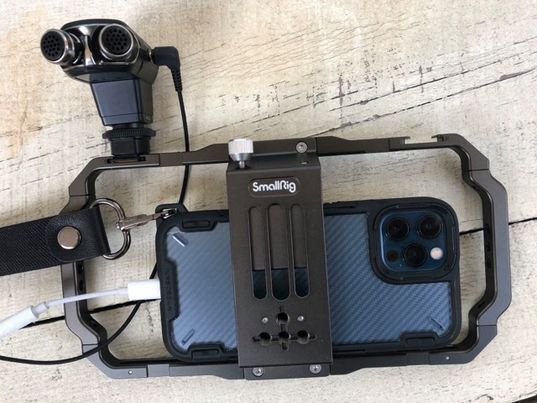 スマホにリグを装着し、ガンマイクを外付けしています。(経費削減のため、ガンマイクは、一社)monnamiの物を使用しています)他、ピンマイクを使用。