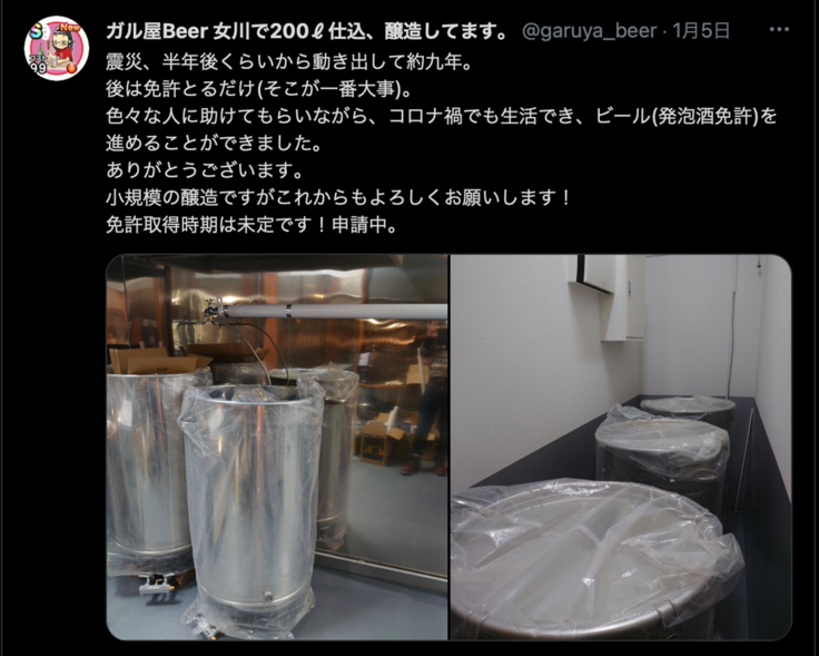 その後、2013年に女川に戻り、醸造所を始める準備を開始。初めは醸造できる場所もなく、きぼうの鐘商店街という仮設商店街で、ガル屋をオープンしました。