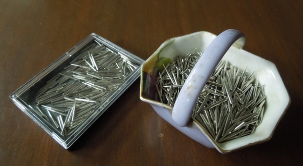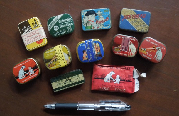 左が通常使用している針(未使用)で、右が使用済み針です。なんとなく捨てるのがもったいなくてため込んでいます。もし蓄音機コンサートの記念に使用済み針が欲しいかたがいらっしゃいましたら、終演後に声をかけてくださいね。
