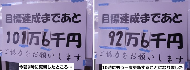 図書館入口の立て看板でカウントダウンを始めました。今朝出勤して支援総額をチェックして金額を修正したのが左側。金額修正後、自席に戻ってもう一度支援金額を確認したところ、四百万円を突破していたので、慌ててもう一度金額を修正したのが右側です。