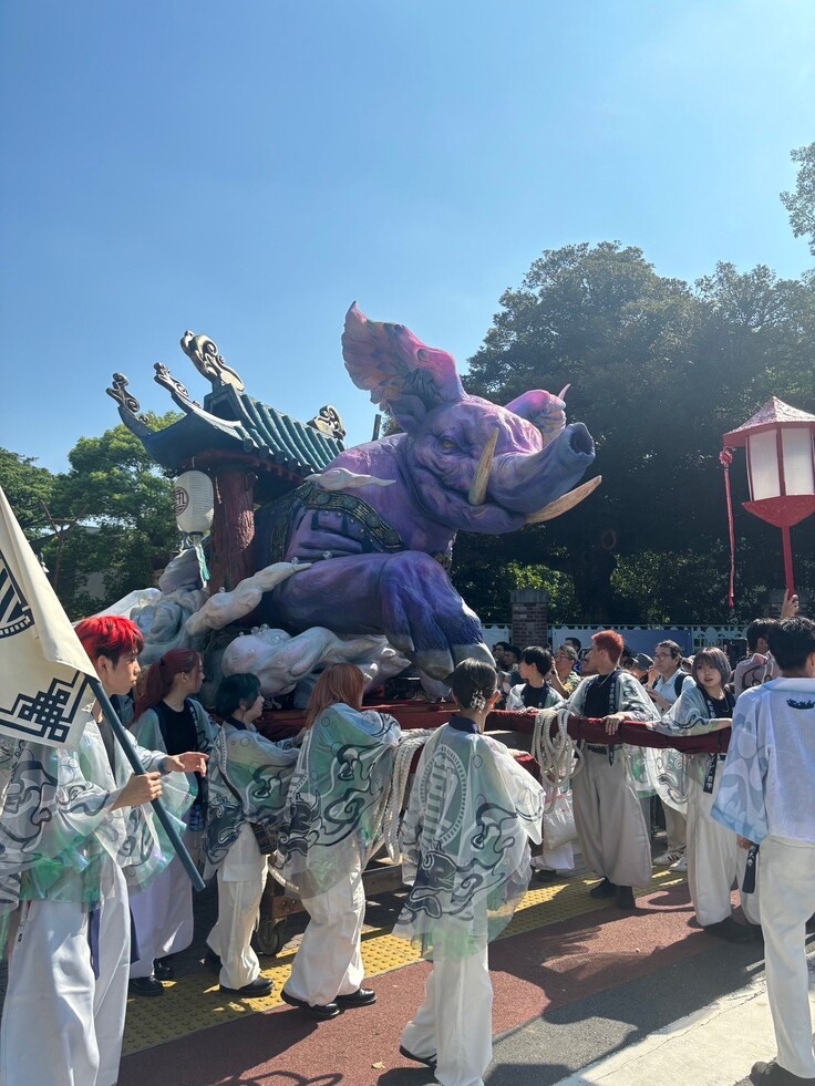 学部1年生が音楽学部・美術学部混合で4チームに分かれ、ひと夏をかけてオリジナルデザインの御輿と法被を制作しました。