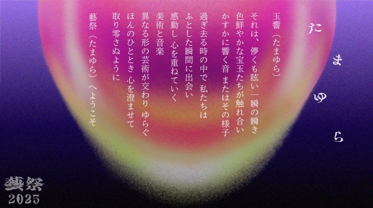 私たち藝大生というひとつひとつの宝玉が、この藝祭2025というイベントで、ときに孤高に光り輝き、ときに触れ合って、かすかに音をたてる……藝祭2025で鳴り響く、私たちが織りなす『たまゆら』を、ぜひ感じていただけますように。