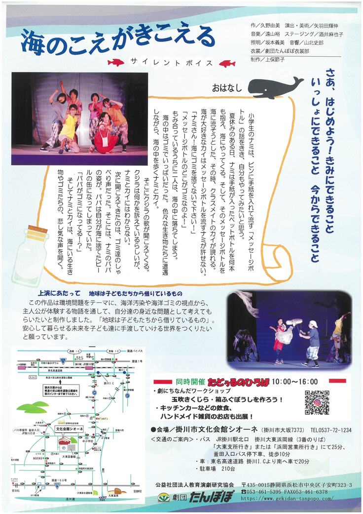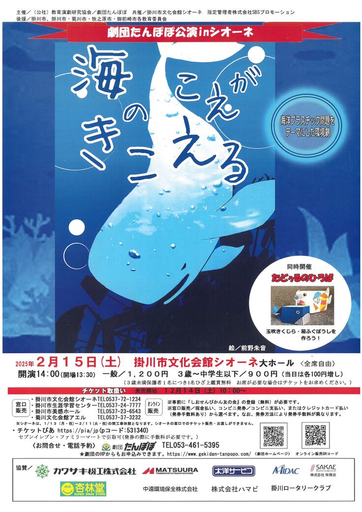 2025年2月15日(土)、掛川市文化会館シオーネにて、劇団たんぽぽ「海のこえがきこえる」を上演いたします。この作品は、海洋プラスチックごみ問題をテーマにした環境劇です。テーマを聞くと、難しそう、おもしろいのかな? と思う方もいらっしゃると思いますが、お芝居として、子供から大人まで楽しんでいただける内容になっています。