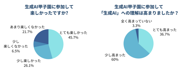 アンケート結果では、参加者の約72%が「楽しかった」と回答し、約97%の参加者が「生成AIへの理解が高まった」と実感しています。