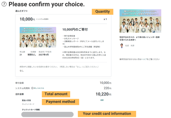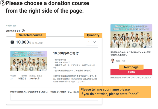 | Donation receipt/thank you message/Activity report report(Will be sent by email in PDF format)/Your name will be published on the Toyama University Hospital website (if you wish)/Your name will be posted in the hospital (upon request) | ||