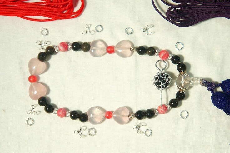 ●使用できる主となる石は、水晶やオニキスやローズクォーツと限られますが、おおむね画像の様な簡単な華念珠ができ上ります。