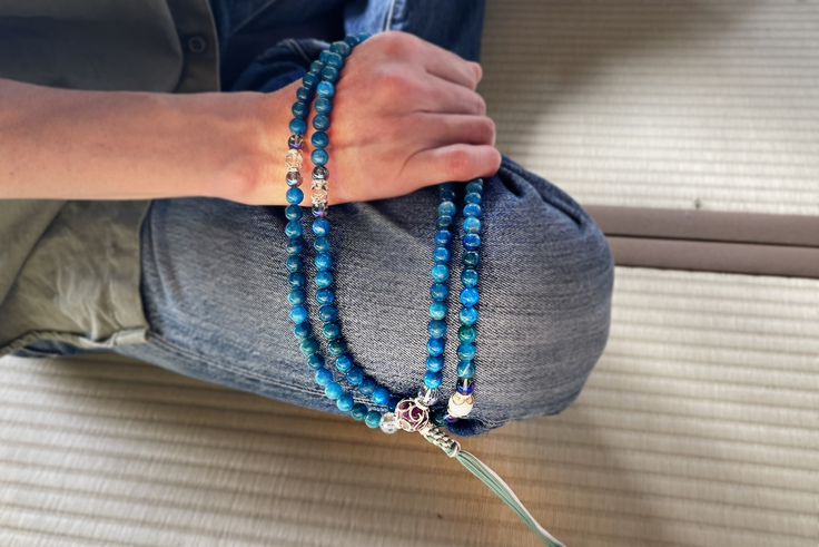 ▼珍しいアパタイトの数珠。お好みの天然石でのオーダーができるリターンも 。