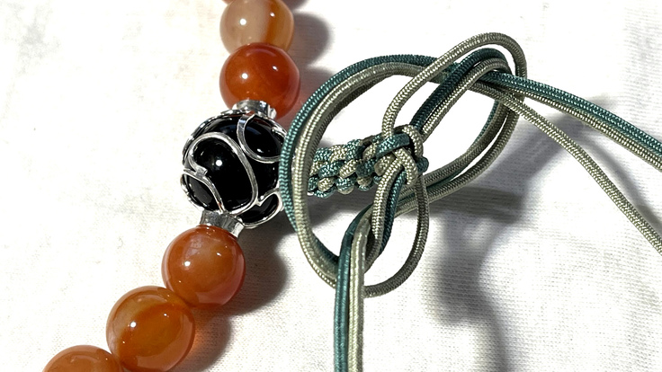 ・これまでの自身の使用や、ジュエリー念珠のユーザーの方々からのお申し出により、水濡れに弱いと思われる伝統房は使用せず、高価な数珠にしか使われない正絹の「組紐」を採用し、ひとつひとつ手編みで仕上げています。
