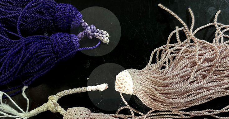 ▼以前の作品で使っていた伝統房は、上・親珠に結ばれている部分はとても切れやすく、下・湿気を与えるだけで水糊が溶けてすぐにはずれます。この交換だけなのに数珠すべての糸を通し直さないといけませんでした。(今はお客様のお申し出により、組紐に交換しています)