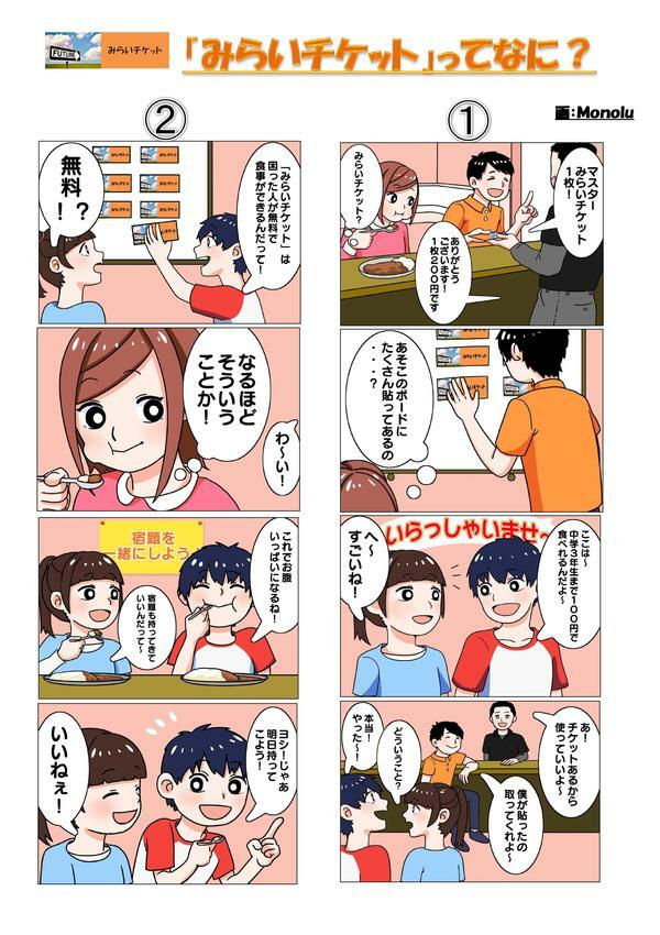 地域の「見も知らない人の厚意」を「みらいチケット」として1枚200円で購入し、壁に日付を書いて貼り、困っている人が「ごちそうさま!」をする。このような助け合い活動をしています。