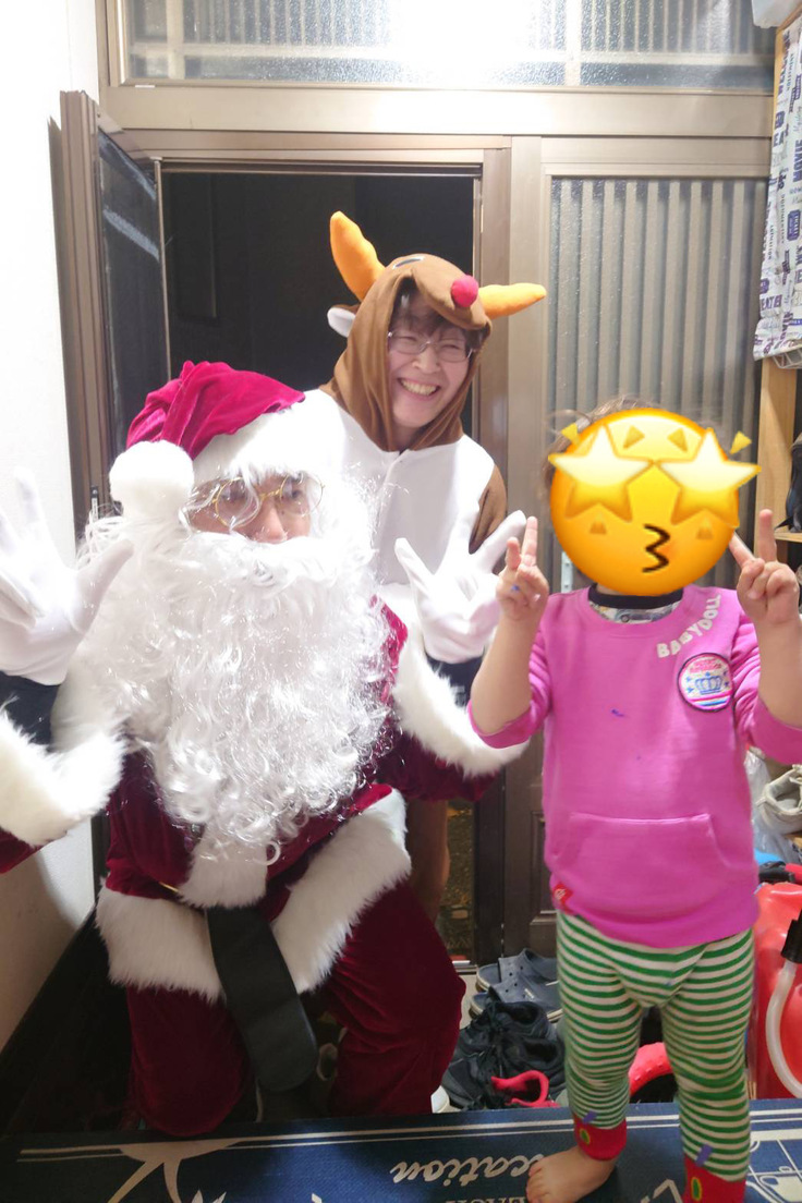 玄関のチャイムが鳴り、扉を開けるとそこにはサンタとトナカイ。