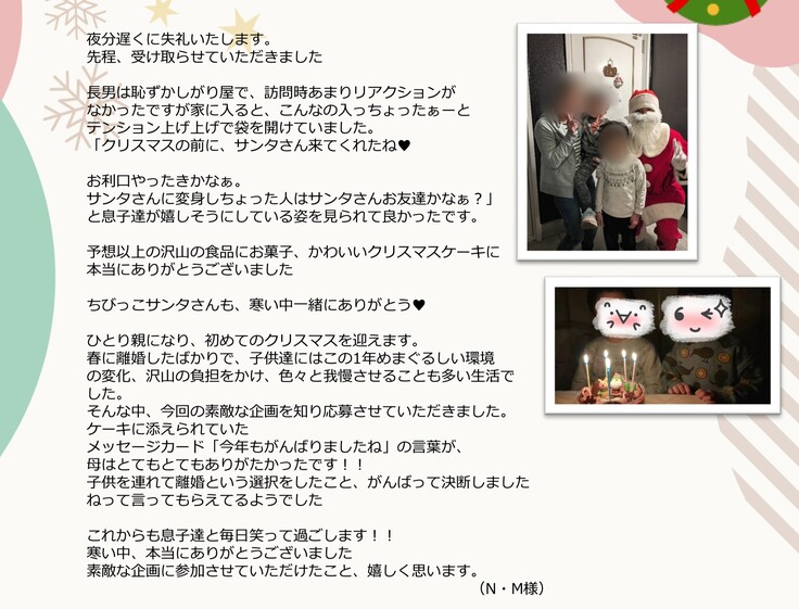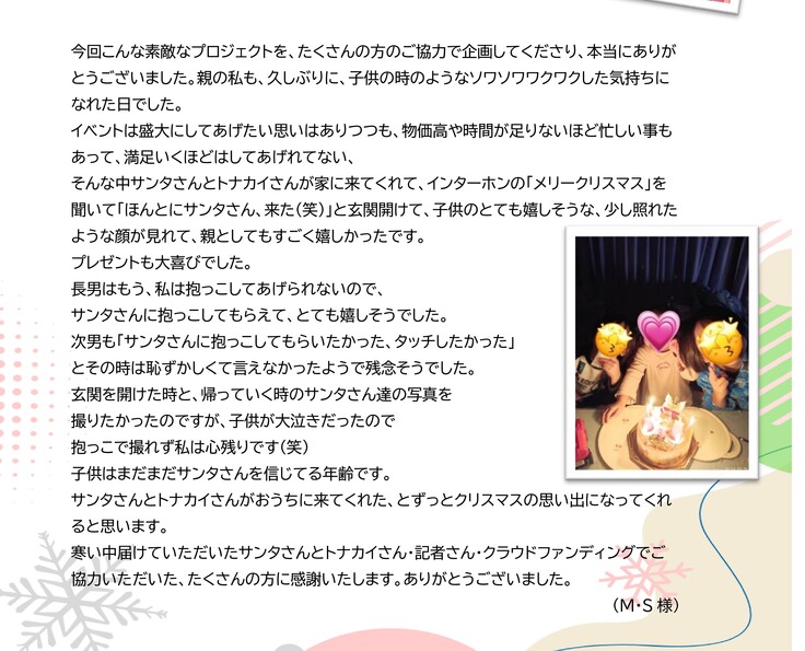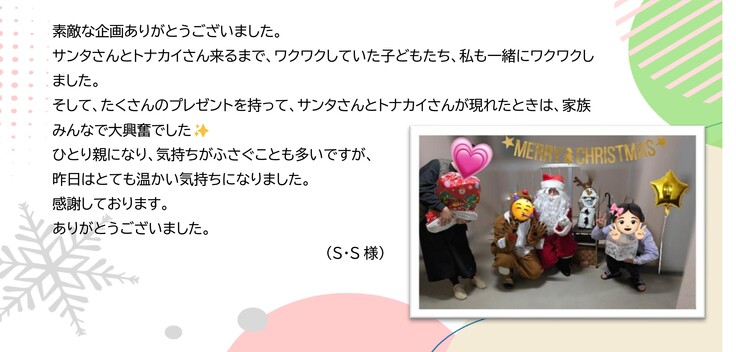 (日程については、平日のクリスマスではなく、家族の時間をゆっくり過ごしていただける“次の日が休みの土曜日”にお届けしています)