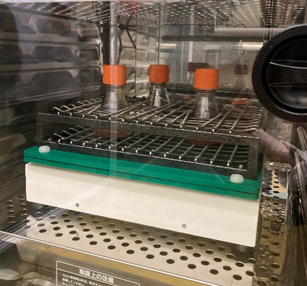 (左図)インキュベーターの三角フラスコの中で、スパイク糖タンパク質を作製するための細胞を培養しています。