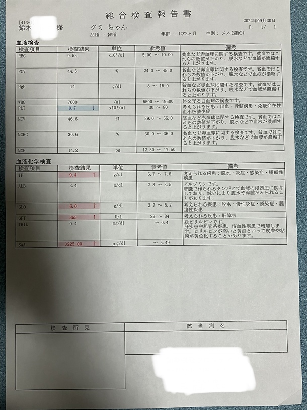 投薬後は元気な姿が見られていますが、やはり検査結果はまだまだなようで。