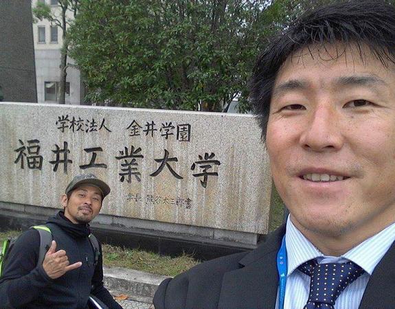 福井工業大学での特別講師↓ 右)栗本教授 左)辰己選手