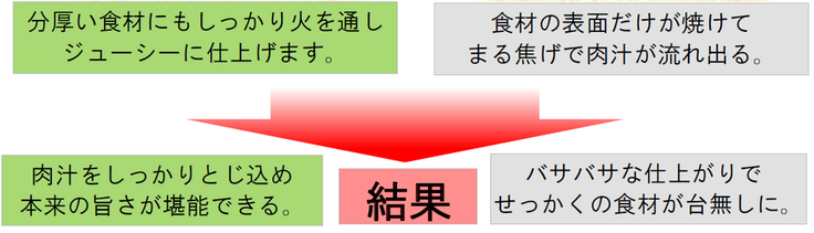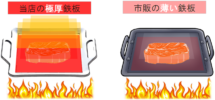 熱は鉄板によって蓄えられる量が違います。 当店で取り扱う商品は、熱を十分に蓄えることができ高温で食材全体を包み込むことができるのに対し、薄板品は蓄熱量が少なく表面のみが高温となるため、食材に十分な熱を伝えることができません。 そのため表面は黒焦げ、中は生焼けなんて経験はございませんか? 鉄板焼き屋、お好み焼き屋などで美味しく感じるのは、分厚い鉄板で一気に焼き上げ、旨みを凝縮するからなんです。