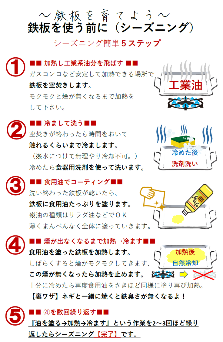 当店の鉄板は極厚で扱いがとても簡単ではありません。正にプロが使う鉄板です。通常ご家庭で使用する調理器具は『簡単便利』が基本です。しかしこれは、育てながらコツを掴みあなたの好みに仕上げていく一品。 一生の友を手に入れて男のあぶないを体験しませんか?
