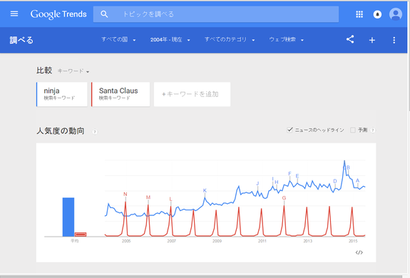 下のグラフは、Google Trendsで忍者がどれほど国内外で人気があるか示したグラフでござる。忍者が世界中で人気があるでござるが、まだまだ表舞台にたって任務ができていないでござる。拙者は、このたび、与えられた任務で、日本国内・世界中で活躍したいでござる。そして、拙者の仲間になってほしいでござる。
