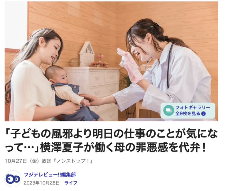 「子どもの風邪より明日の仕事のことが気になって…」横澤夏子が働く母の罪悪感を代弁!(フジテレビュー!!)