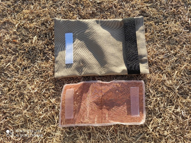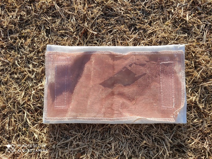 内側には、抗菌抗ウイルス加工生地の布に銅繊維シートをマジックテープで挟んで製作しました。