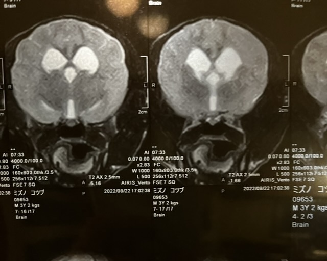 日に日にこつぶの様子がおかしく歩けているが足はフラフラ、寝ている事が多くなってきたため再受診、先生からMRI検査ができる病院に行くように言われ紹介してもらったのですが、滋賀県にある病院ではMRI検査ができる病院が1件のため予約の電話をしましたが直近で予約はできませんでした。