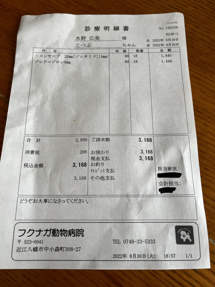 外耳炎の継続治療でかかりつけ医に受診、診察台に乗せたときに、こつぶの姿勢が気になると先生から言われ、もしかしたら椎間板ヘルニアではないかと言われ、薬で様子をみる事に、ステロイド剤を処方してもらい1週間後に受診するように言われました。