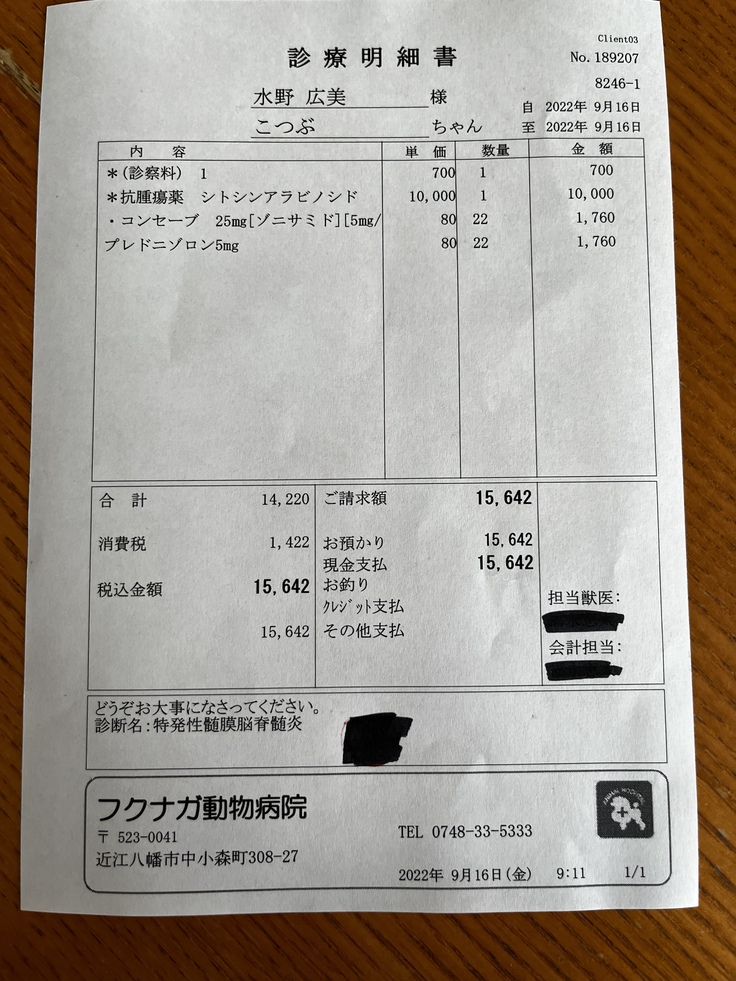 先生からは私にもわかりやすく丁寧に色々と説明があり、副作用がなく順調にいげば長くて3年、事例では5年まで生きている子もいますと、副作用がでてしまうと1年と短命になる場合もあると説明を受けました。