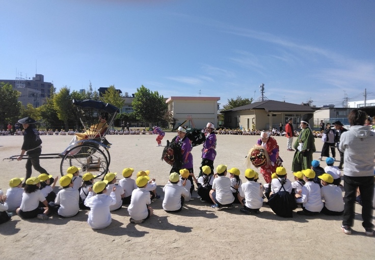 「現代の子ども達にも地域の伝統行事に触れる機会を」と、地元小学校のご協力により、渡御行列が校庭を一周する機会を設けていただいています。一行が到着すると、お迎えするために校庭に出た子供たちの歓声があがり大賑わいとなります。