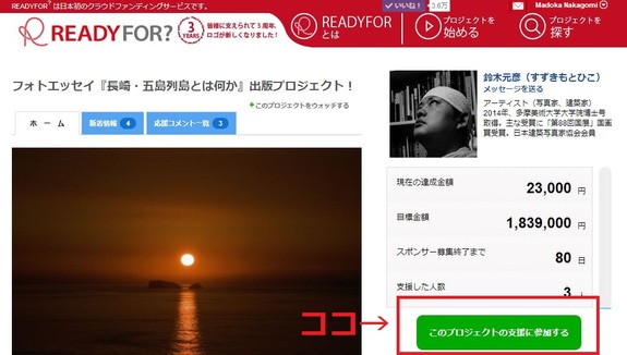 1)プロジェクトページの緑のボタン「このプロジェクトの支援に参加する」を