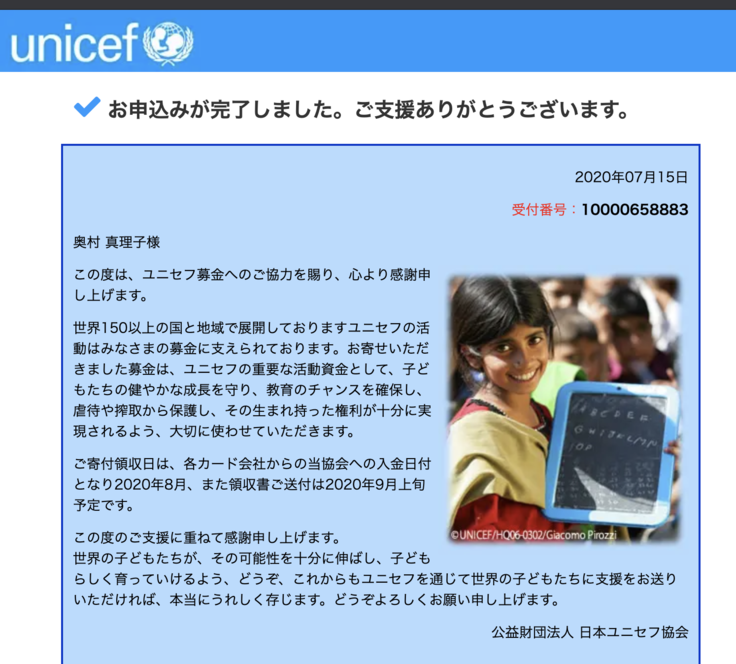 なお、UNICEFからの領収書は、メールにて送付させていただきますが、年末調整などの都合上、年末に領収書をいただく可能性があるので、メールでの証明画像送付は来年の年始になる可能性もございます。