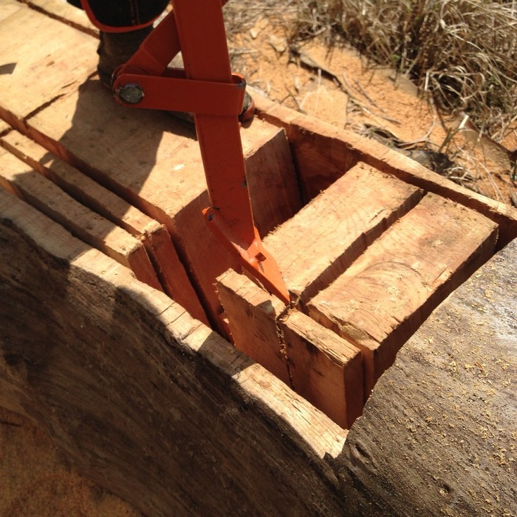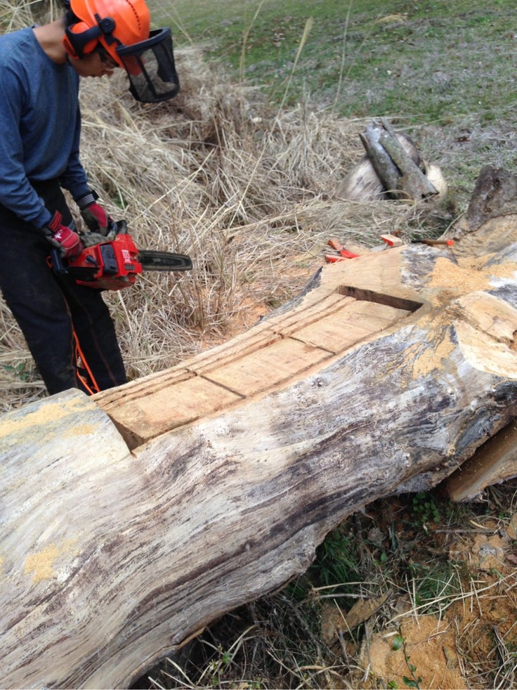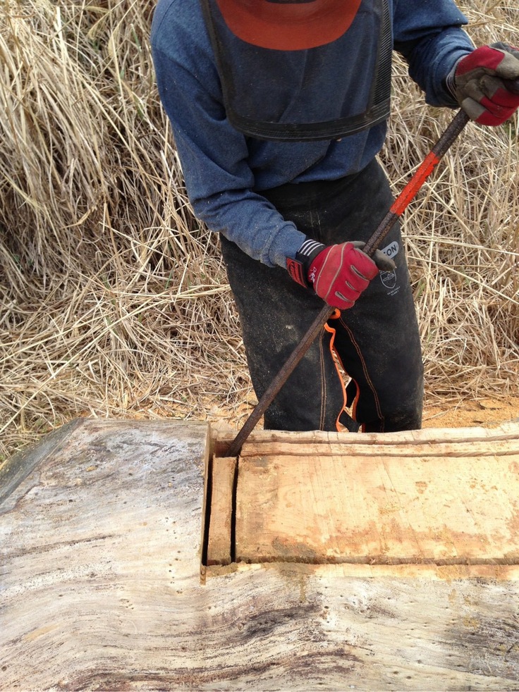 チェーンソーでつっこみ切りをして細かいブロックに分けた後、それらをバールなどでこじって取り出します。めっちゃ大変です。