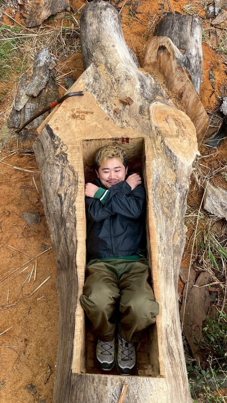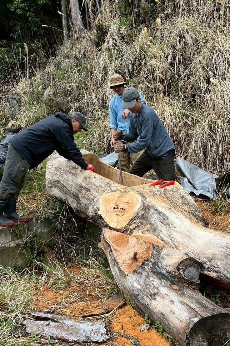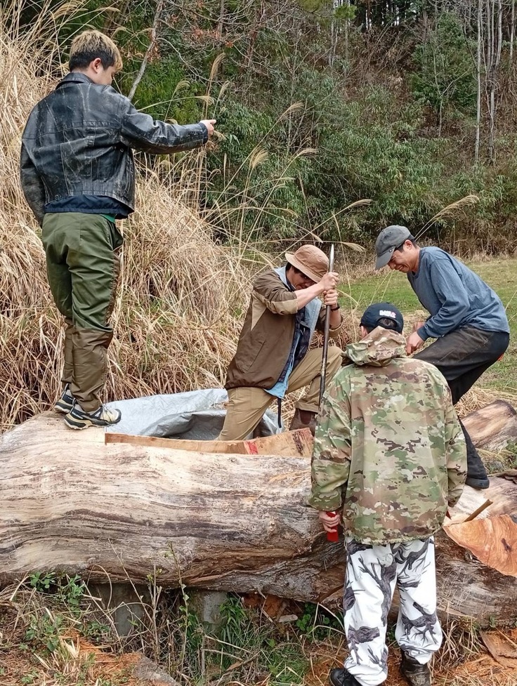 現在、直径80cm全長3mのケヤキの巨木をくり抜いて作っています。めっちゃ大変です。