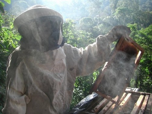 <養蜂所でお手伝いをしている私。写真を取ってくれたのがドン・タショでした★>