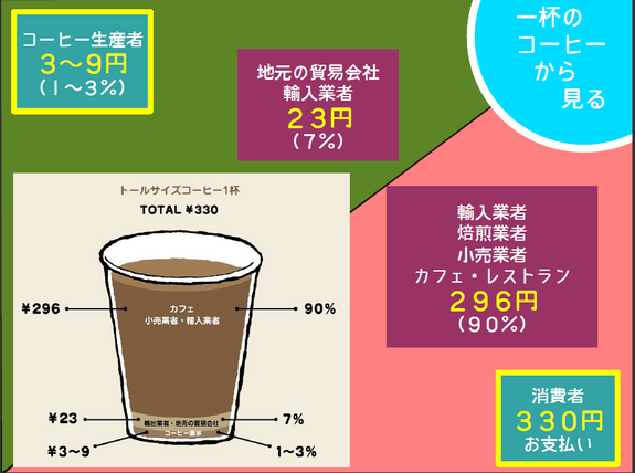 カフェに行ってトールサイズのコーヒーを330円で買ったとします。実際にそのコーヒーを育てて収穫した人たちが受け取るのはたったの1~3%、3円~9円。