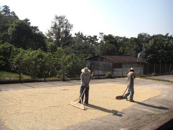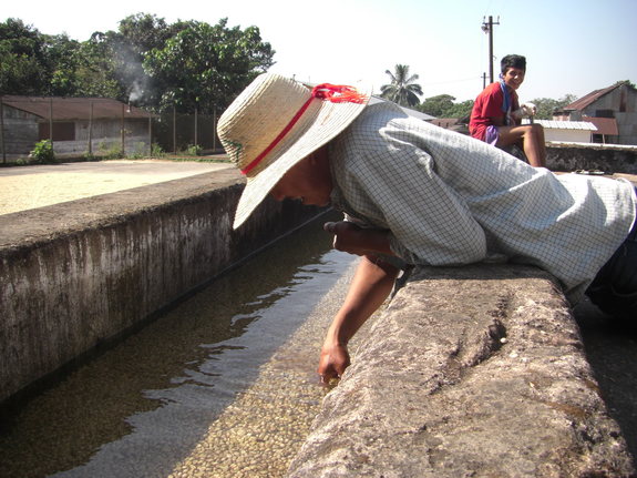 乾燥。炎天下の中、コーヒー豆が一定の湿度になるまで何日も繰り返される大変な作業!