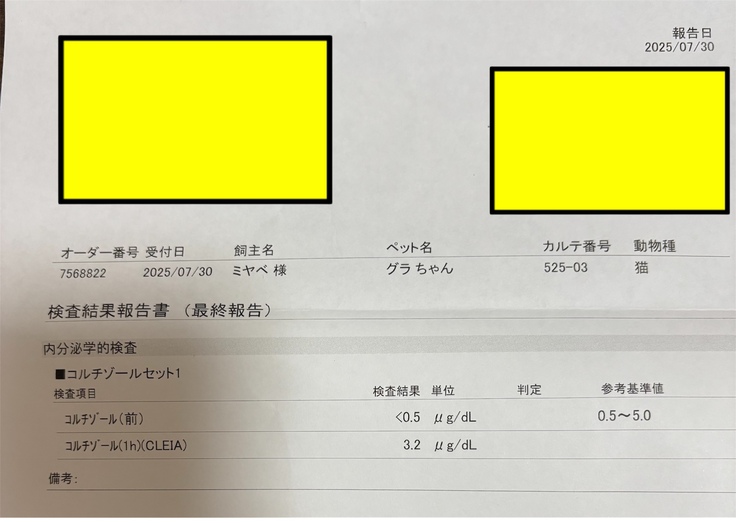 前回お伝えしていたコルチゾールを測った検査結果の用紙が送られてきました