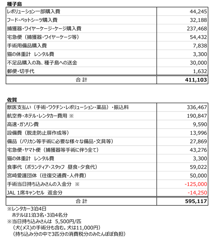 皆様方からいただきましたご支援をTNR開催のために使用させていただきました。