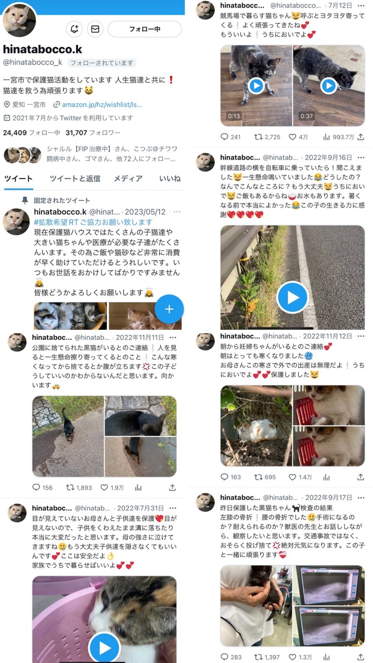 以前からhinataboccoさまのXをフォローさせていただいておりまして、保護依頼の連絡があるとすぐに現場へ駆け付けて懸命に保護活動をされているお姿に心を打たれていました。