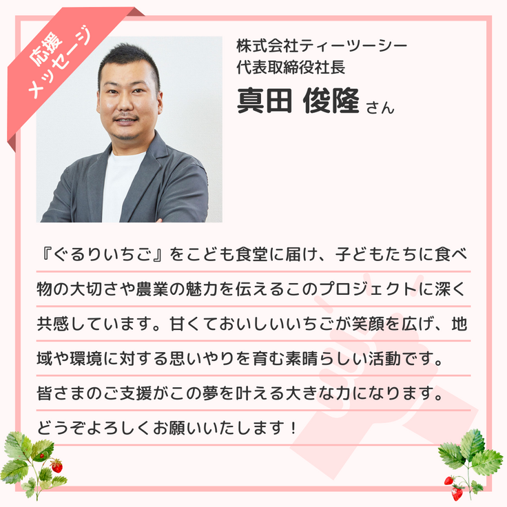 『ぐるりいちご』をこども食堂に届け、子どもたちに食べ物の大切さや農業の魅力を伝えるこのプロジェクトに深く共感しています。