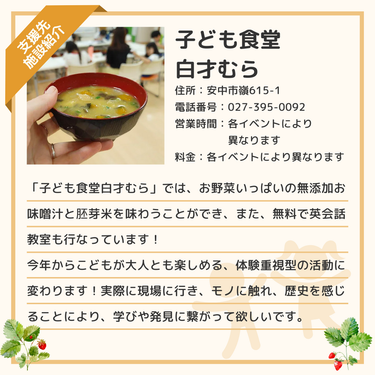 「子ども食堂白才むら」さんでは、お野菜いっぱいの無添加お味噌汁と胚芽米を味わうことができ、また、無料で英会話教室も開催されています📚